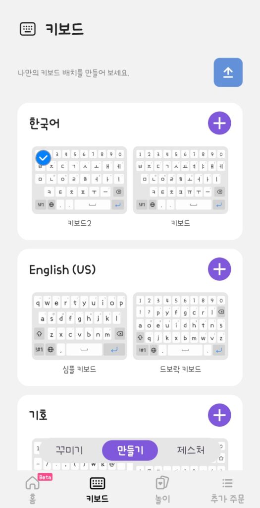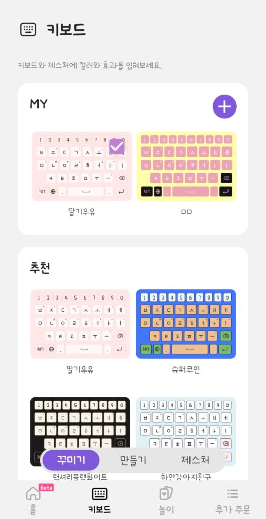 - 추천 항목에서 원하는 키보드를 선택하거나 MY 옆에 플러스 버튼을 눌러서 직접 설정