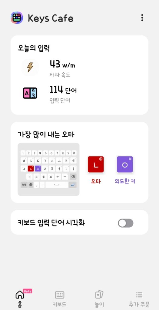 이 기능을 활용하면 자신이 어떤 키에서 실수를 많이 하는지 쉽게 알 수 있어 키 배열을 조정할 때 참고하기 좋습니다.
