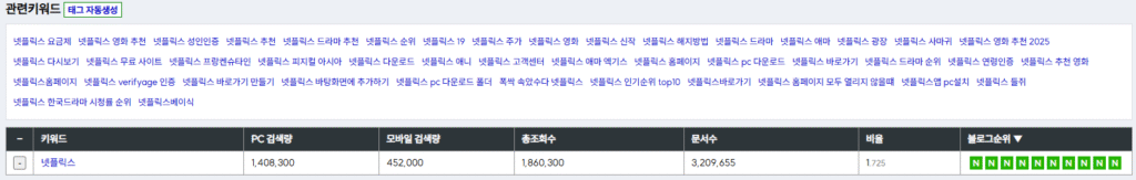 너무 검색량이 높으면 포털 검색 상위에 올라가기 어렵고, 문서 수가 많으면 이미 시장이 차 있어서 경쟁력이 약해집니다.